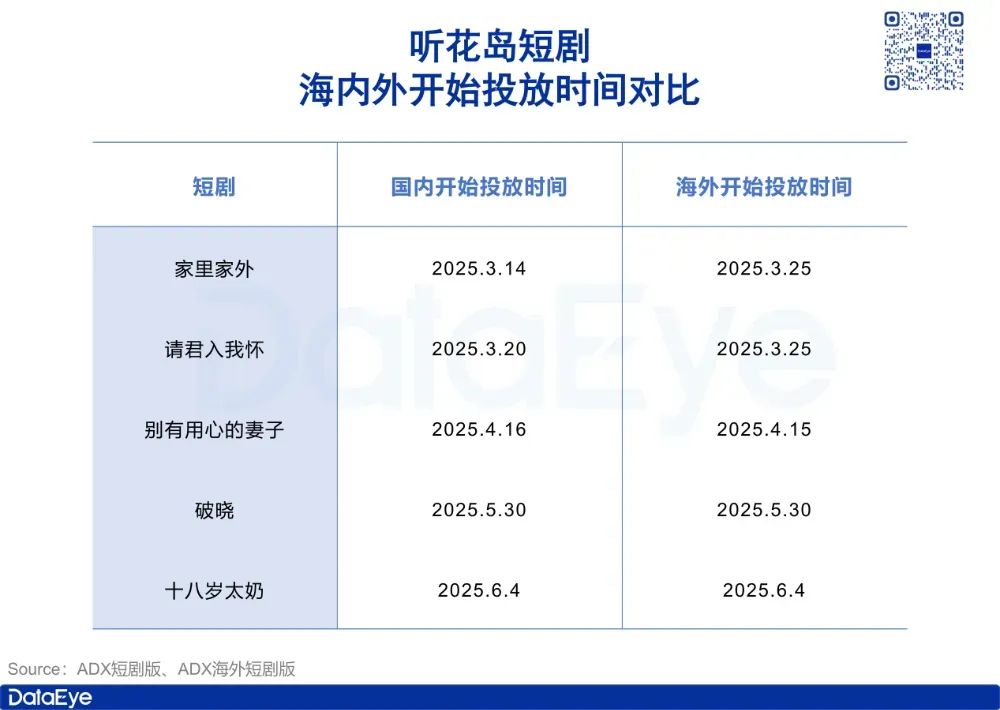 ADX数据显示,从3月份开始,国内外听花岛和掌上合作短剧的投放时间逐渐接近。从《家庭之外》到《请你进我怀》的时间间隔为11天,再到接下来的三部短剧几乎同时开播,这意味着其合作短剧的投放时间在国内外也趋于同步。