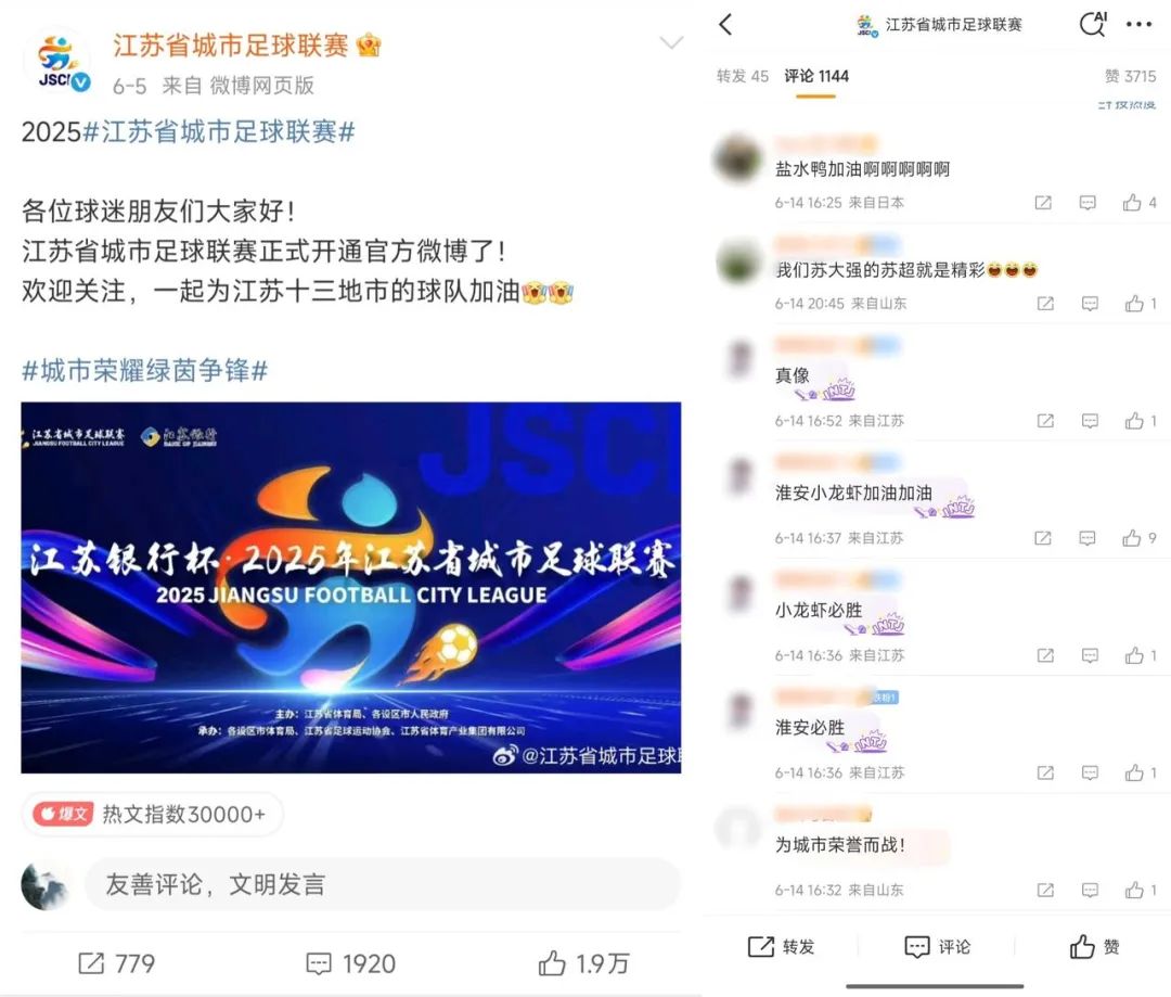 @江苏省城市足球联赛 (苏超官方微博)评论区,当地网友还不用地名,用特产代名给油:“盐水鸭冲啊”、龙虾必胜”、"我们苏大强的苏超就是精彩!"