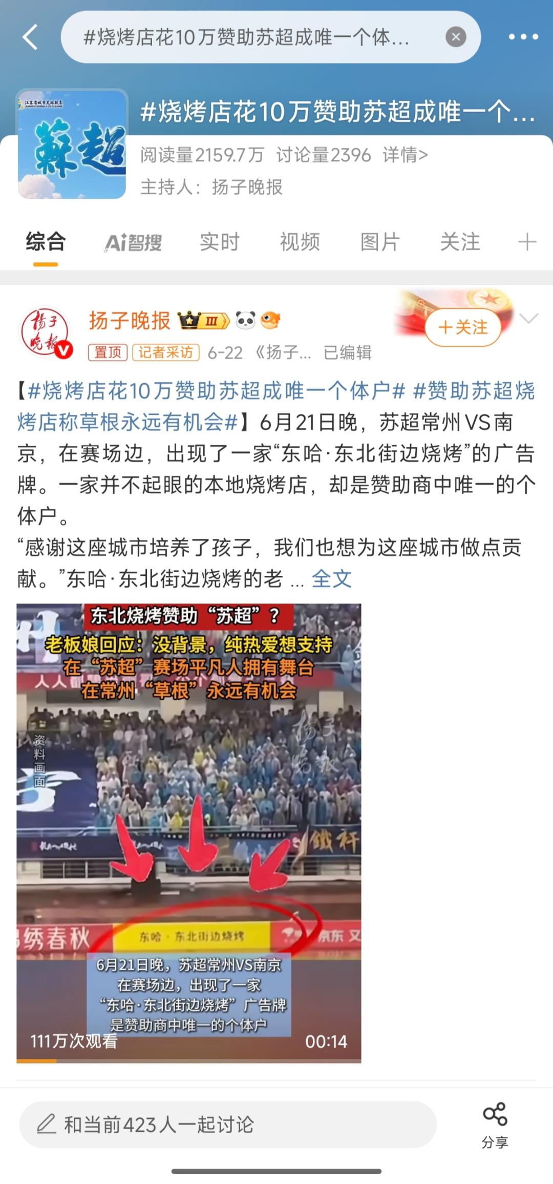 虽然村BA已经验证了打破基层赛事的潜力,但苏超的人气仍然超出预期。特别是在比赛开始的时候,个别团队很难获得赞助,这也让#烧烤店花10万赞助苏超成为唯一的个体户#,最后,烧烤店广告与江苏银行、JD.COM等国际品牌并列。