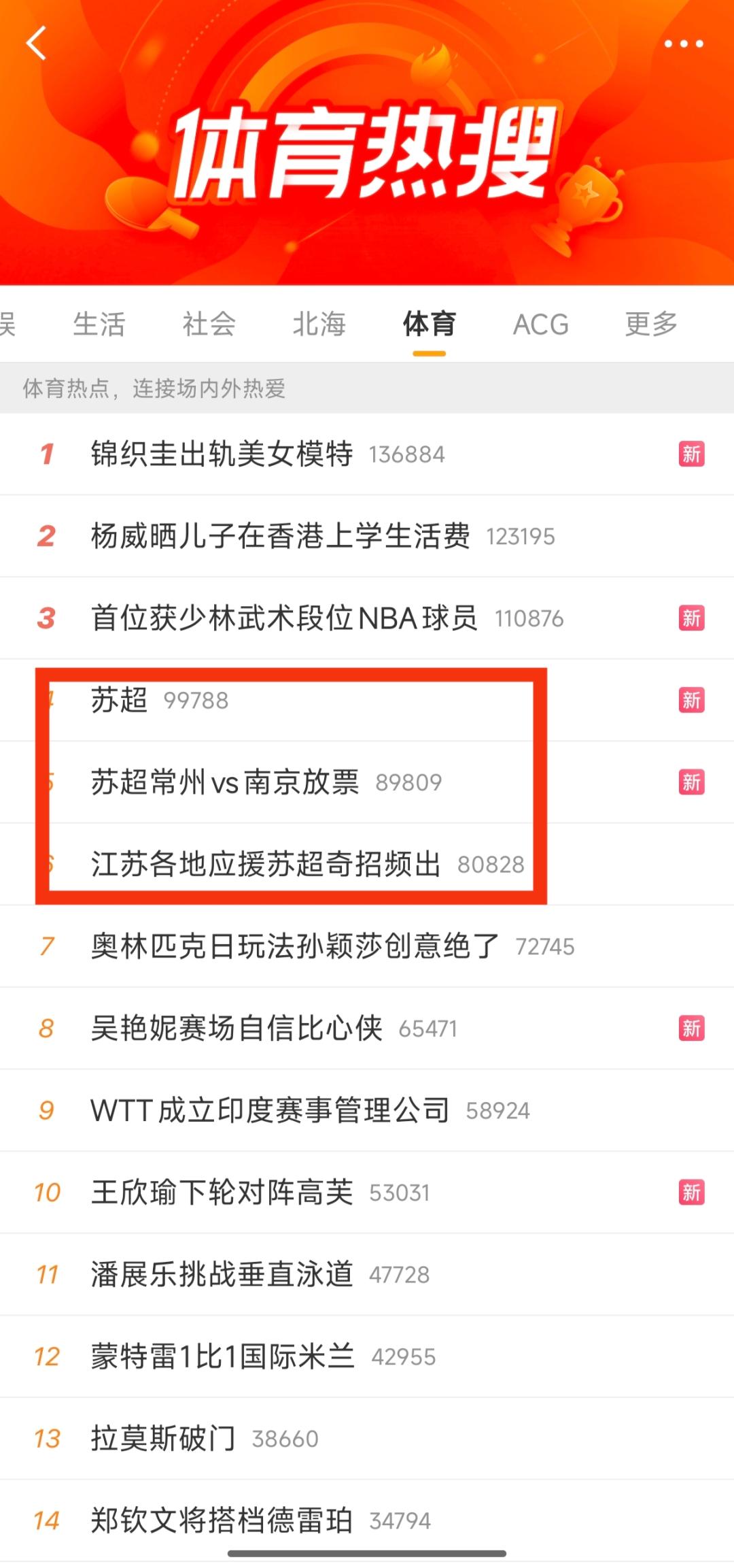 场均观众超过3万人,讨论度超过中超,热门比赛很难买到票。甚至在微博体育热搜榜上,苏超在短时间内压倒了孙颖莎、吴艳妮、潘展乐、郑钦文等体育明星...