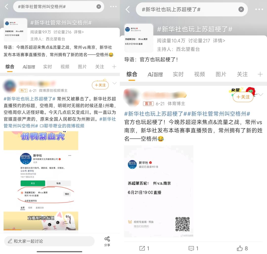 第五轮苏超,@新华社 “常州VS南京”在直播预告中被称为“州VS南京”,用空格代替“常”字。