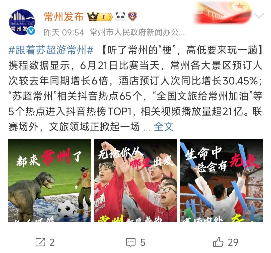 根据@常州发布 数据显示,仅6月21日比赛当天,常州各大景区预订人数较去年同期增长6倍,酒店预订人数较去年同期增长30.45%,可见比赛对城市文化旅游的强大驱动作用。