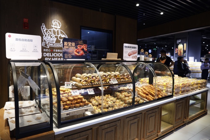 走进调整后的商店,现烤面包的香味便弥漫在鼻子里。在透明的操作室里,师傅正在把面包坯送到烤箱里,旁边的明星产品“有很多快乐的真菌”堆积成一座小山。肉眼可见的真菌颗粒与马苏里拉奶酪粉融为一体,咸香扑鼻;在榴莲千层、瑞士卷等经典甜品旁边,展示了与胖东来同款的DL芋泥雪贝和焦糖可以赞美蛋挞。烘焙区以“不隔夜”的健康标签成为昆明家庭下午茶的新选择。