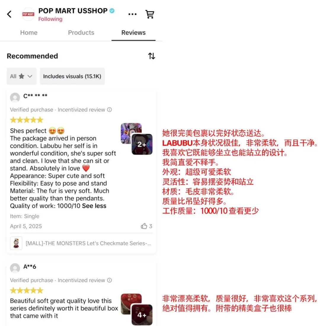 正是解决办法发现,泡泡玛特TikTok Shop美国商店的一些买主评价说,评价的“粒度”非常详细。