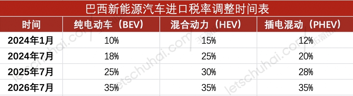 巴西一度对电动汽车免征关税,2023年为推动生产本土化,巴西工贸部宣布将从2024年起恢复对纯电动、插电式、油电式混合动力汽车等新能源汽车的进口税征收,并逐步提高税率,直至2026年7月,相关税率将上升至35%。