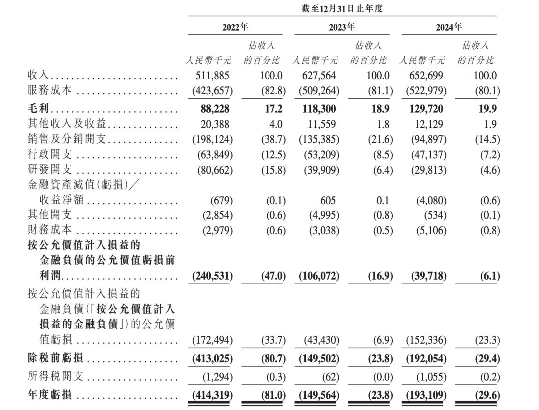 财政方面,2022年、2023年和2024年,微脉实现收入分别为5.12亿元、6.28亿元和6.53亿元;同期年度亏损分别为4.14亿元、1.50亿元和1.93亿元。值得注意的是,虽然2024年营收增速有所放缓,但亏损从2022年的4.14亿元缩小到1.93亿元,说明商业模式正在从“烧钱扩张”向“提高效率”转变。