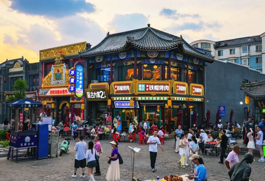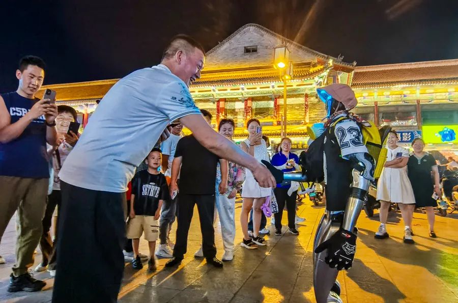 与宇树人型机器人在塞上老街旅游休闲区互动。