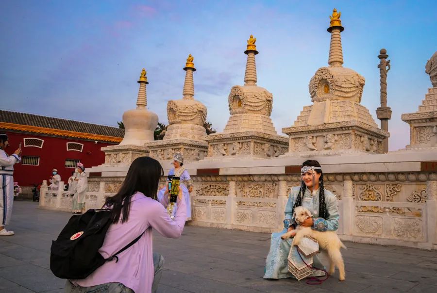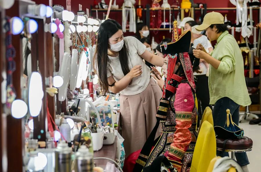 旅游者在塞上老街旅游休闲街区的一家旅游摄影店化妆。