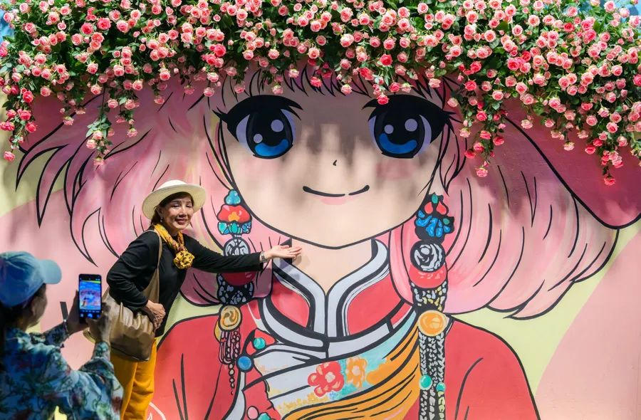 在塞上老街旅游休闲区一处花墙微景观前,游客拍照。