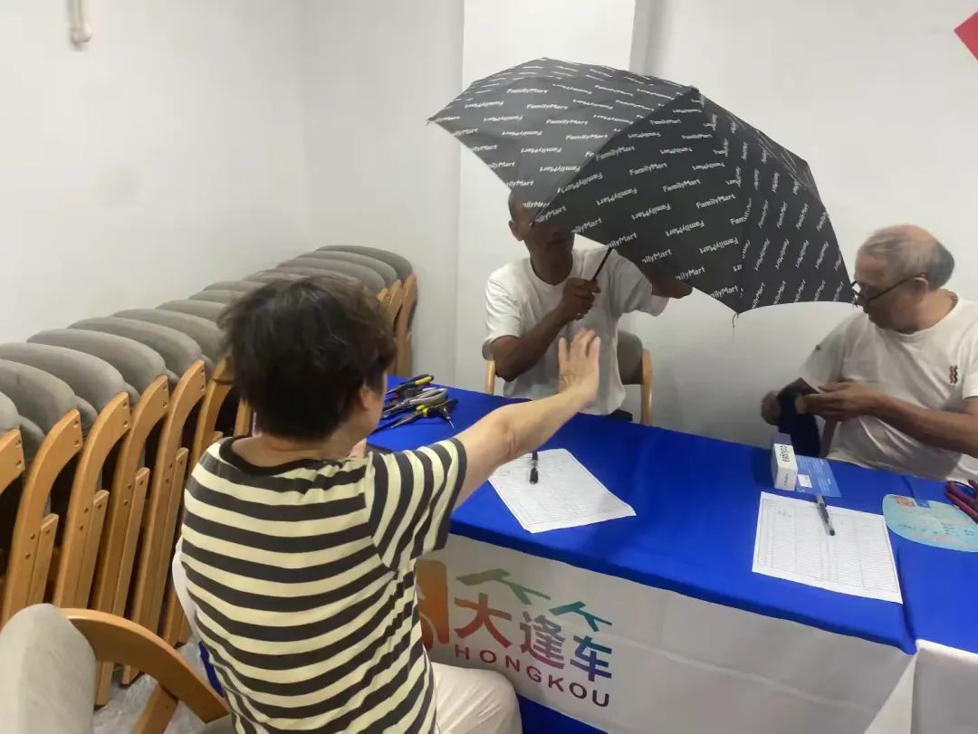 现场非常热闹,包括修复、健康咨询、生活服务等多个项目,为居民在家门口创造了一个便利的世界。在修复服务区,居民被修伞、磨刀、磨剪、检修时钟的摊位包围着。李阿姨在家里带了一把“退休”的伞。在师傅们巧手的修复下,受损的伞又“支棱”了。 起来,李阿姨不停地给师傅点赞。
