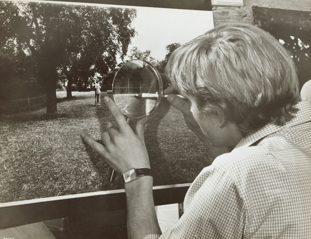 显然,在冲洗照片的过程中,“放大”动作是安东尼奥尼从《魔鬼的流口水》中获得的关键灵感,以至于他用这个动作命名了自己的电影。但是,如果《魔鬼的流口水》中的照片被放大成挂在墙上的想象屏幕,那么在《放大》中,放大照片的目的是逐渐发现和揭示隐藏在胶片颗粒中的线索;在这里,拍摄不是想象中的催化剂,而是真实的证据片。正因为如此,安东尼奥尼并没有像小说中那样让摄像师陷入幻想的追溯,而是安排他在现实中真正回到现场发现尸体。