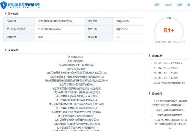 根据网络经社“公司风险评级系统”(CREDIT.CN)“有道精品课程”所属网易有道信息技术(北京)有限公司的风险评级为R1 ,当前企业风险较低。