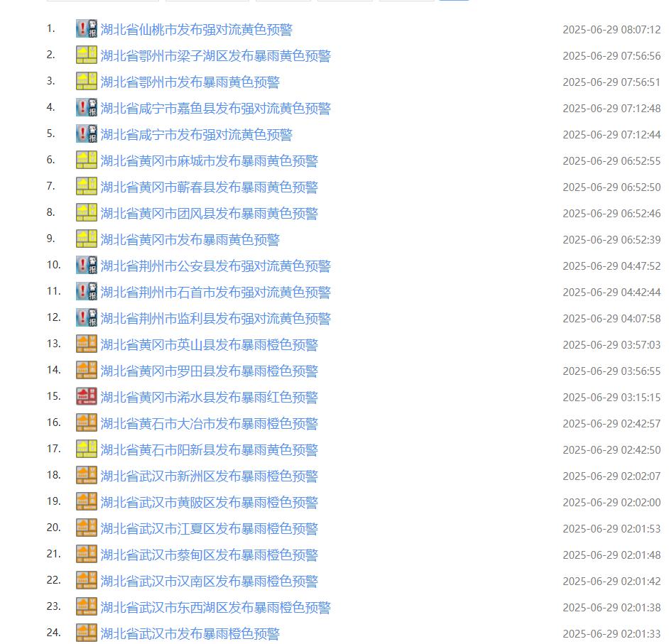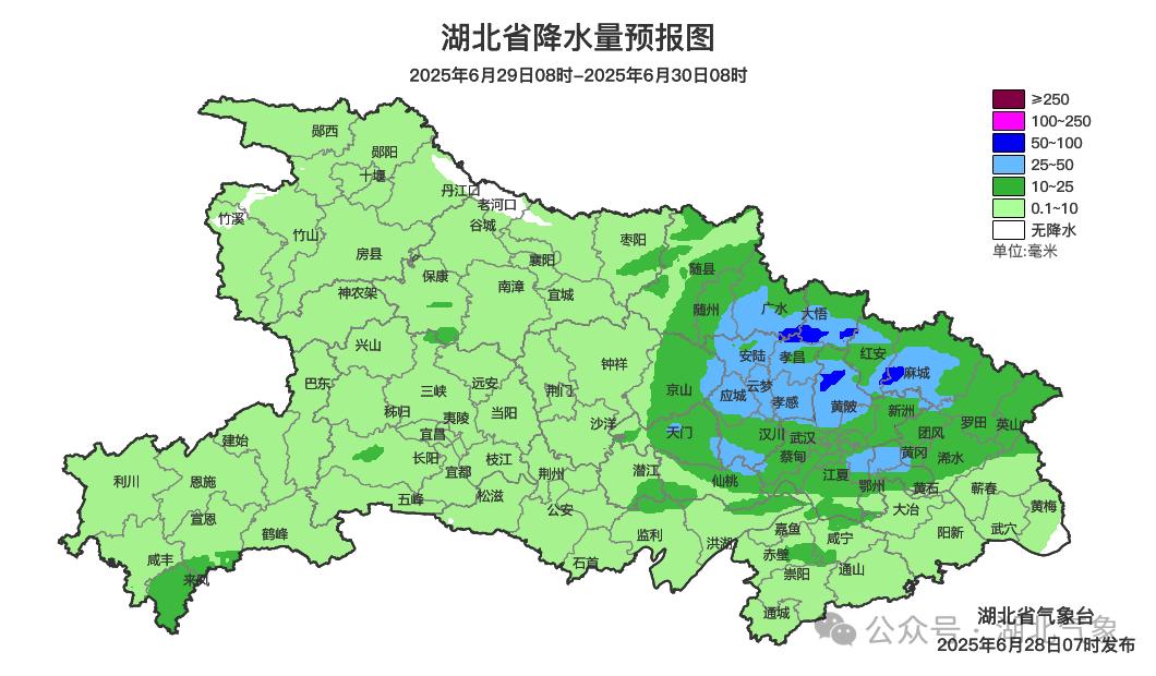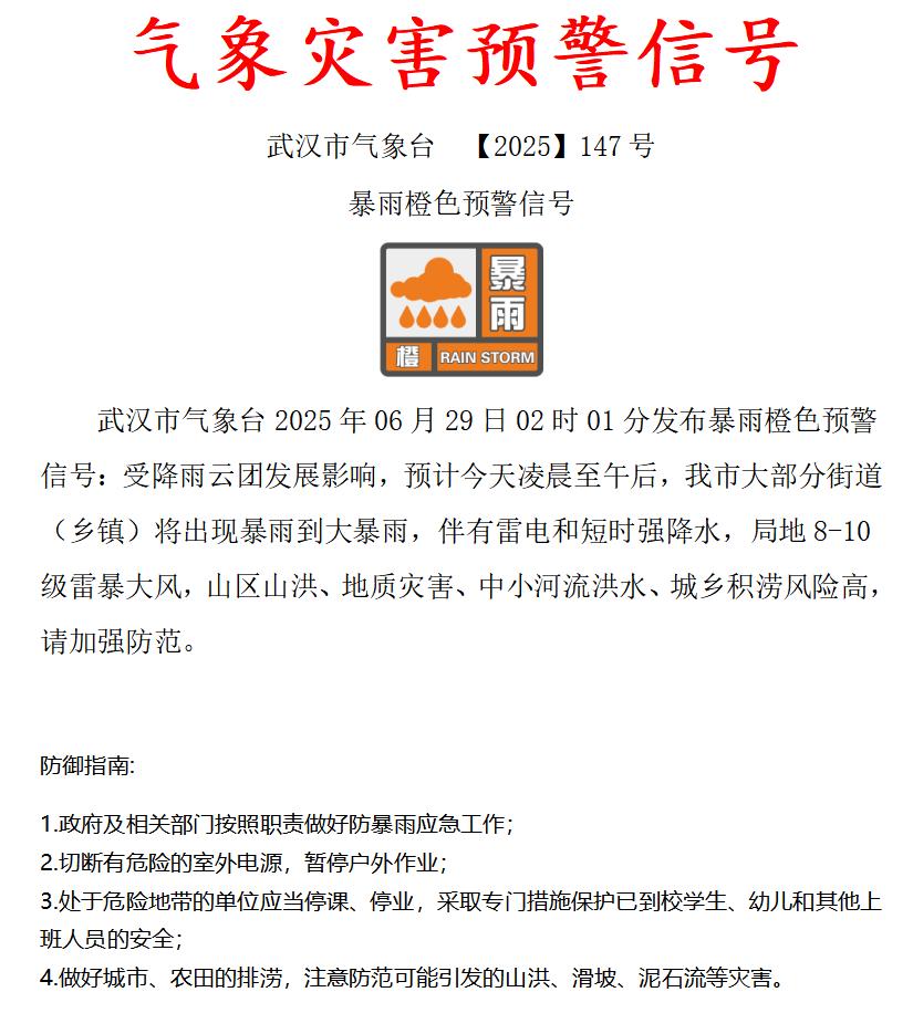 6月29日08时至30日08时,全省阴天有阵雨或雷暴,其中江汉平原东部、鄂东北部、鄂东北部有中至大雨,局部暴雨。该省的局部地区伴随着强对流天气,如短时强降水和雷暴。西部最高气温32~35℃、中东部28~最低温度为32℃。~26℃,3至4级偏南风,5至7级阵风。