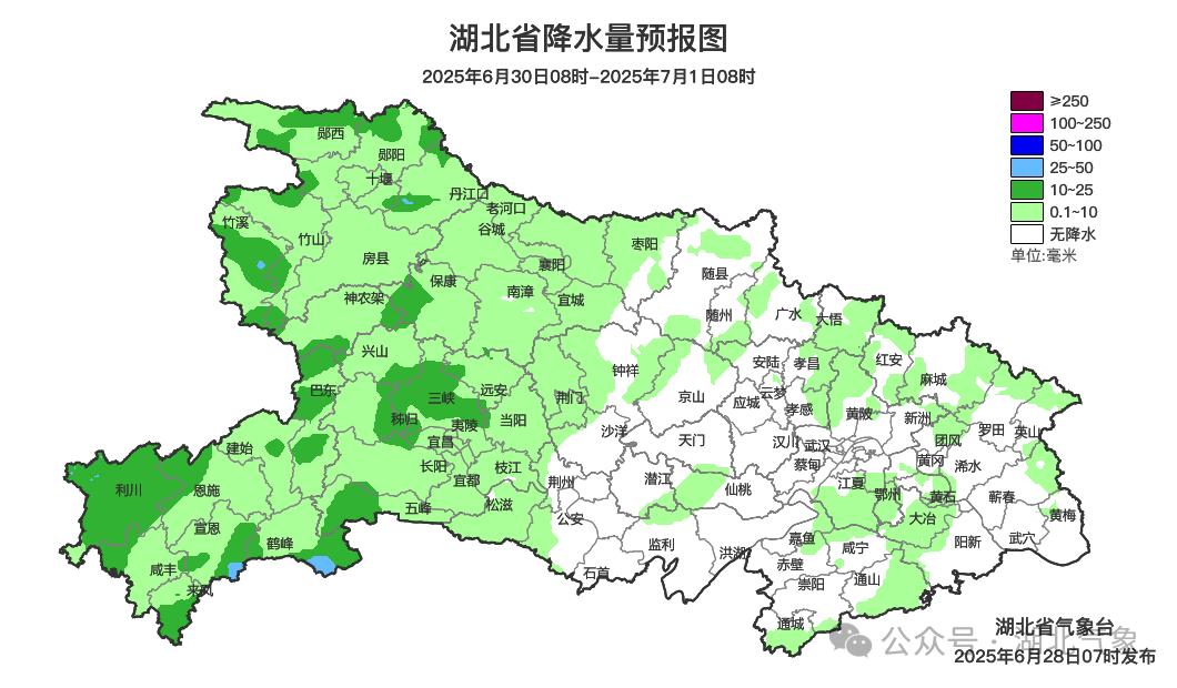 6月30日08:00-7月1日08:00,鄂西北、鄂西南阴天有阵雨或雷暴,局部地区伴有短期强降水、雷暴、大风等强对流天气;其他地区阴天,下午有阵雨或雷暴。西部最高气温29~33℃、中东部33~西部最低温度为36℃22℃。~25℃、中东部25~29℃,3至4级偏南风,5至6级阵风。