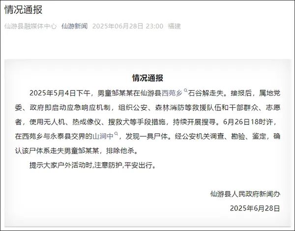 据福建省莆田市仙游县媒体中心微信微信官方账号“仙游新闻”消息,仙游县人民政府新闻办6月28日发布情况报告称,5月4日下午,男孩邹某某在仙游县西苑乡石谷走失。接到报告后,当地党委、政府启动应急响应机制,组织公安、森林消防等救援队伍、干部群众、志愿者,继续通过无人机、热成像仪、搜救犬等方式进行搜索。六月二十六日十八时许,在西苑乡与永泰县交界处,发现了一具尸体。经公安机关调查、调查、鉴定,确认该尸体系走失男童邹某某,排除谋杀。