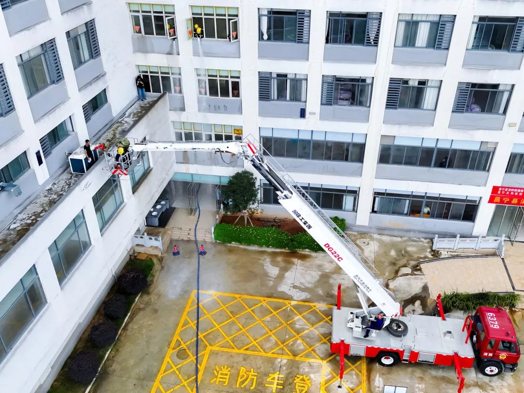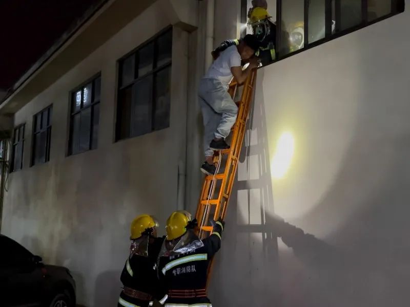 群众在紧张有序的火灾逃生演习阶段,亲身经历了借助拉梯从窗口紧急逃生的过程。