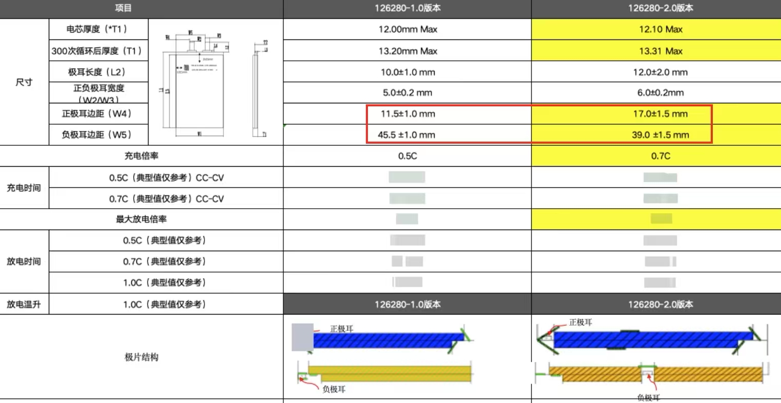 根据两个版本的对比图,V1.0 版本和 V2.0 电池版本最显著的区别在于正负耳之间的距离以及极耳在整个电池上的布局。正负耳距离方面 V1.0 版本为 34mm,V2.0 则是 22mm;就电池布局而言 V1.0 正负耳的版本更接近两边, V2.0 这个版本更加居中。