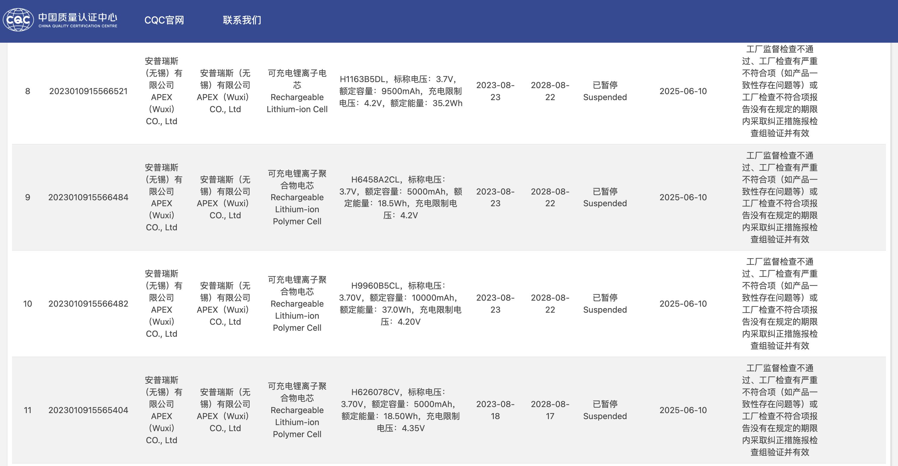 一方面,根据社交媒体上对召回型充电宝的多个拆解视频,这些充电宝确实使用了安普瑞斯的电池。更重要的是,根据中国质量认证中心的查询记录,安普瑞斯(无锡)有限公司的 11 个 3C 认证均「已暂停」,并且注明同样的原因:
