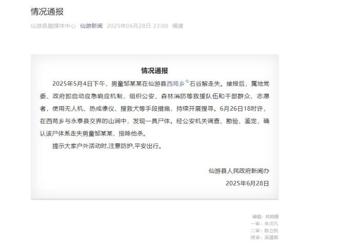 2025年5月4日下午,男孩邹某某在仙游县西苑乡石谷解走。接到报告后,当地党委、政府启动应急响应机制,组织公安、森林消防等救援队伍、干部群众、志愿者,继续通过无人机、热成像仪、搜救犬等方式进行搜索。六月二十六日十八时许,在西苑乡与永泰县交界处,发现了一具尸体。经公安机关调查、调查、鉴定,确认该尸体系走失男童邹某某,排除谋杀。