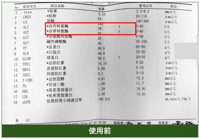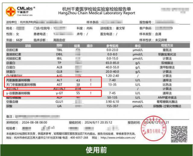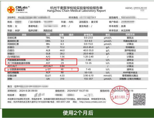 看看新发布的真实案例,66 年龄较大的妇女,体检时丙氨酸氨基转移酶,天门冬氨酸氨基转移酶,y- 肝功能指标数据如谷氨酰基转移酶均超标。