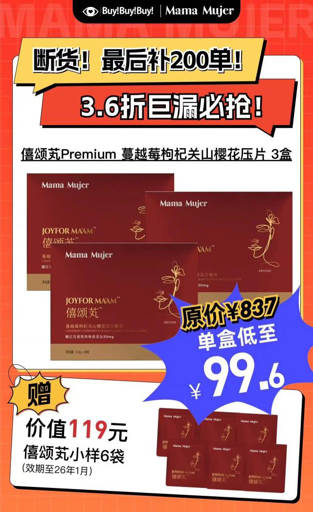 赞美,缺货预警,最后, 200 单箱,单箱低至9x,送同样的样品。 6 袋