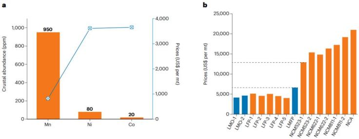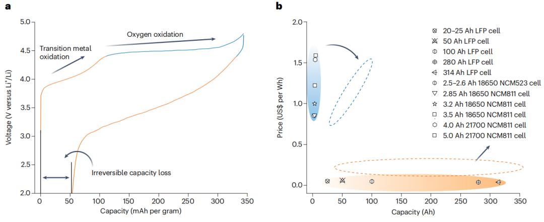 富锂锰基氧化物(LRMOs),使用Li1.2Mn0.例如,54Ni0.13Co0.13O2(LRMO54)被认为是一种有吸引力的替代材料。锰(Mn)地壳的丰度高于镍(Ni),但是市场价格低于镍(图1a)。另外,LRMO材料独特地利用了过渡元素(TM)高电压(>4.5)和氧的氧化还原活性V)在高镍正极(NCM811)中,下运行可提供高达300mAh/g的容量,超过约220mAh/g的限制。LRMO54正极的理论能量密度在材料等级上接近1000Wh//kg。在将最先进的设计策略转化为电池模块等级时,其中电池中活性材料的含量占正极的40~50%,这表明超过700Wh/kg。这一进步可能会重新定义LIB性能,消除与长续航电动汽车和航空等应用所需能量密度的差距。