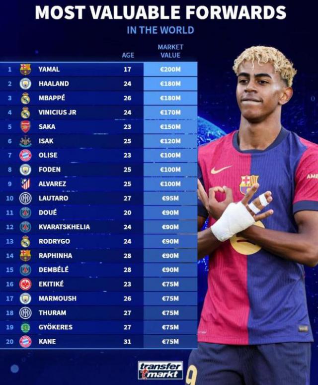 在17岁的亚马尔领先2亿欧元,哈兰德&姆巴佩领先1.8亿欧元,