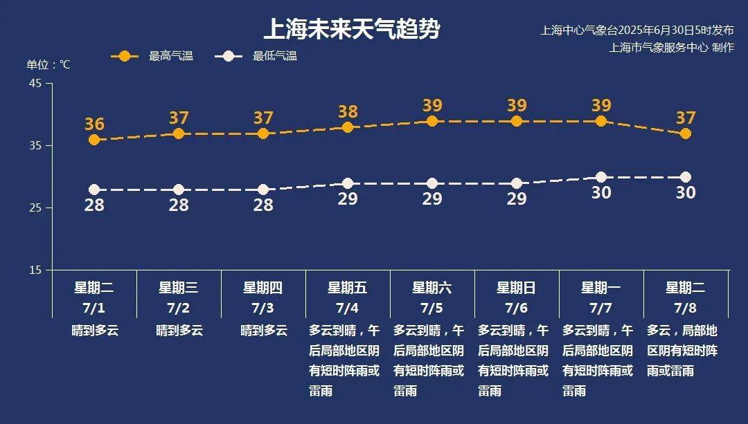 伴随着副热带高压的进一步向西伸展,上海本周以晴热为主,高温持续。上半周最高气温为36。、37℃周围,天气晴朗多云。本周后半段,气温进一步升高,最高气温可能接近40℃。提醒大家特别注意防暑降温。
