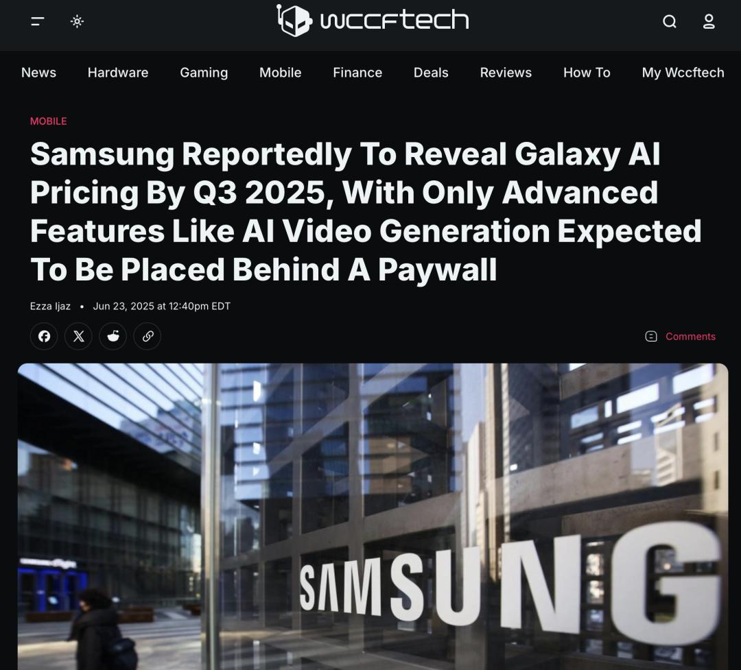 前不久,Wccftech 提及「有传言说三星将在第三季度讨论未来。 AI 服务(Galaxy AI)的定价问题」。从更加直观的角度来看,就是现阶段三星只承诺 Galaxy AI 免费至 2025 年份,考虑到它 AI 其功能包括多个供应商,不排除将来给用户收费的可能性。