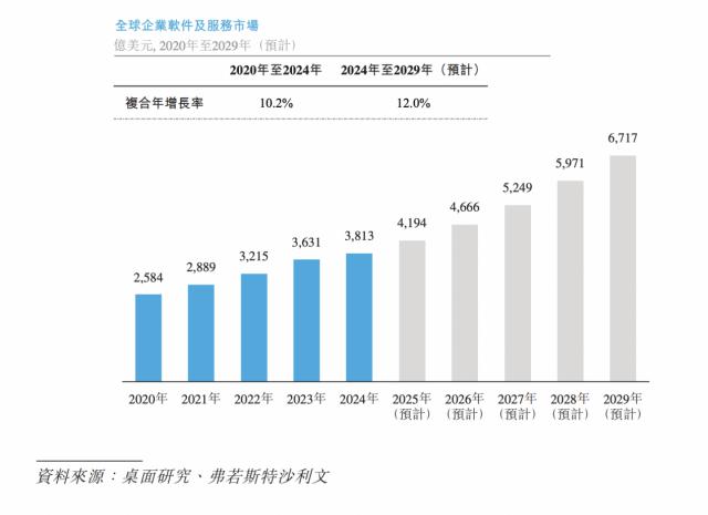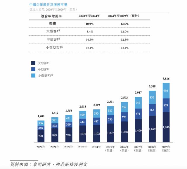 招股书显示,用友网络是企业软件和智能服务的供应商,致力于应用。 AI、以大数据和云计算为核心技术的R&D企业数字智能软件和智能服务的创新、销售和服务。根据弗若斯特沙利文的信息, 2024 年收入计,用友网络是中国企业软件和服务市场最大的市场参与者。