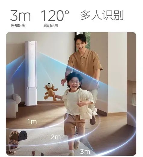美的无风空调系列柜机采用了独创的AI无风技术,配备了毫米波雷达2.0系统,可以智能准确地检测空调前方3米120。°身体活动轨迹在范围内。