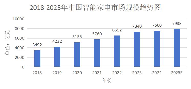 根据中商产业研究院的数据,2018-2024年,我国智能家电市场规模由3492亿元增长至7560亿元,年平均复合增长率为14.79%,预计2025年将达到7938亿元。