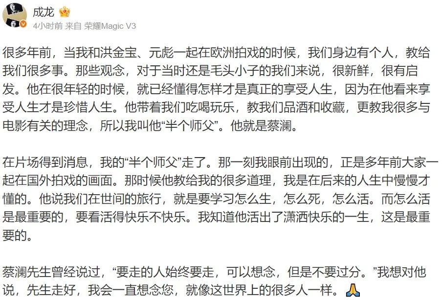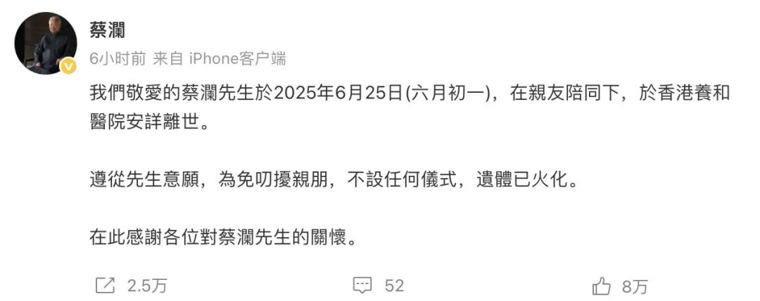 六月二十七日,蔡澜个人账号发布消息:蔡澜先生于2025年6月25日(六月初一),在亲朋好友的陪同下,在香港养和医院安详死亡。