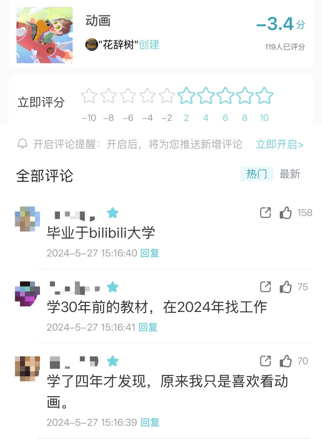 首先要讨论的是,动画专业的学生在学校能学到什么专业知识??很有可能是看10-20年前出版的教材,用20-50年前的案例,讲述近100年的动画历史,然后画画,写生,交作业。即使是一些顶尖学校的动画专业学生,网上经常讨论的话题也会是“报线下班还是学网上课?”“大二报班是不是太晚了?”“不报班真的不行吗?"等等,给人一种明明上了动画专业,却还要三分天注定要七分靠自己的凄凉。大学专业评分中,浪花waves,“毕业于bilibili大学”是动画专业的热评。
