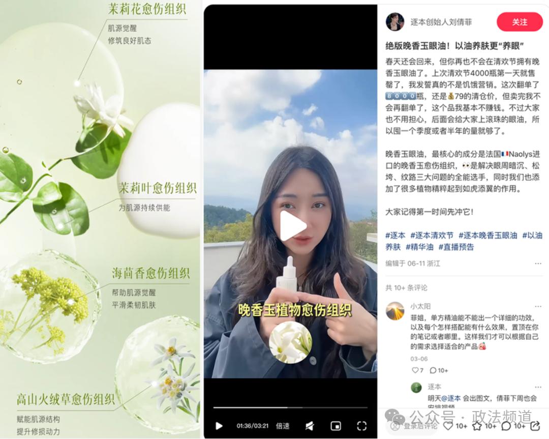 6月25日,该品牌创始人刘倩菲在小红书直播中讲解了各种“逐本香养”系列单方精(净)油产品时,声称该产品可以“长毛毛(发育)”、“调节月经不规律”、“化痰止咳、抗病毒”。被质疑在普通化妆品的宣传中暗示了医疗效果。