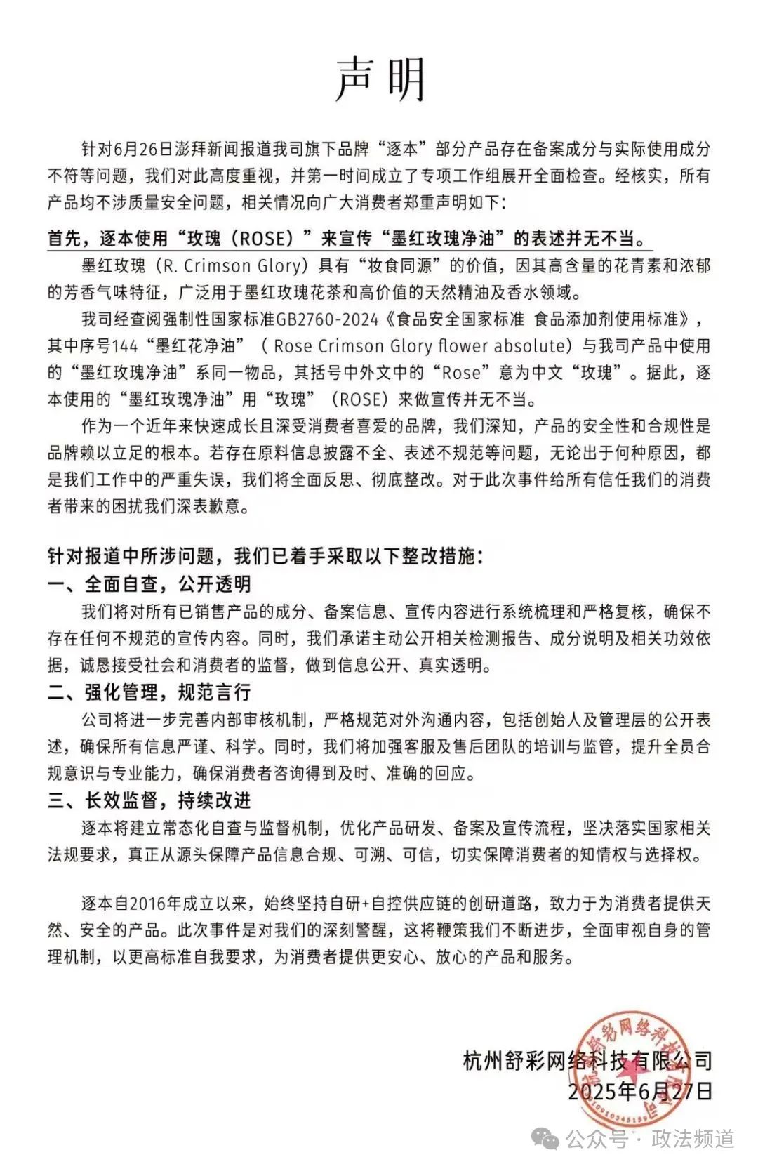 六月二十七日,逐本母公司杭州舒彩网络科技有限公司发表声明,强调“所有产品都不涉及质量安全问题”。针对核心争议,该公司解释说,其产品使用“玫瑰”(ROSE)宣传“墨红玫瑰净油”的表述并无不妥当。逐一表示,在国家标准文件中,144号“墨红花净油”与其商品中使用的墨红玫瑰净油属于同一个物体,逐一使用的“墨红玫瑰净油”用“玫瑰”宣传并无不当。