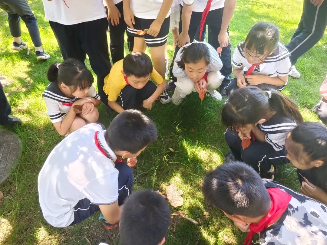 有的同学在果树下捡桃子,有的同学在花园的绿化上发现了很多蘑菇,感觉很新奇。通过“自然观察”,学生、“蒙眼贴五官”、互动环节,如“护眼接力赛”,不仅让眼睛放松,而且体会到生活的美好。
