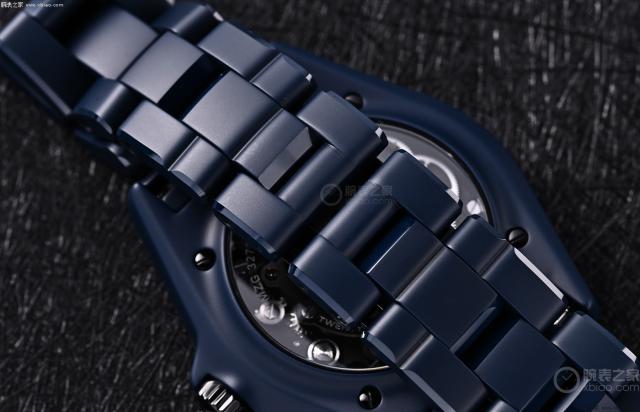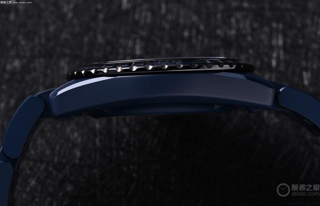 手表配有蓝色哑光精密陶瓷表带,配有折叠表扣。可以看到表带的正面呈现出和表壳一样细腻的质感,斜坡经过打磨,呈现出熟悉的光泽,让表链看起来更加立体有层次感。