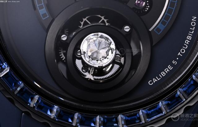J12 BLEU 首款浮动陀飞轮机芯机芯手表搭载香奈儿手表厂打造的裸钻陀飞轮手表 Caliber 5。一颗特殊切割的钻石镶嵌在浮动陀飞轮的框架上,这真的让第一次见到它的人大吃一惊!但这并不是香奈儿第一次在浮动陀飞轮上“创作”。