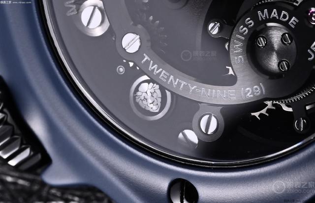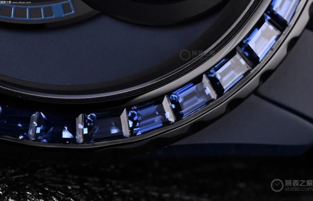 蓝色表盘经过镂空处理,上部分为时针和分针组合的蓝黑分钟轨。表盘的下部是这款手表的亮点——裸钻飞轮!