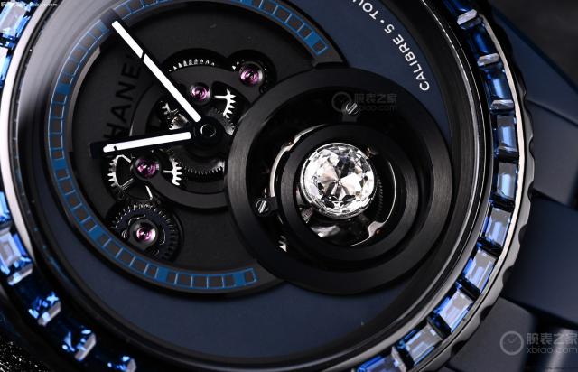 (J12 Bleu 裸钻陀飞轮腕表配有香奈儿自制首款浮动陀飞轮自制机芯。 Caliber 5)