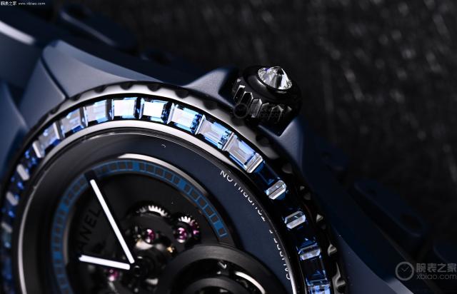 [ 腕表之家 手表品评 ] 关于J12 手表,我们曾经说过,这是香奈儿最好的“实验田”。很多香奈儿高级制表在材料和技术上的大胆想法,都会优先考虑J12手表。2025 2008年,香奈儿建造 J12 Bleu 手表,再一次证实了这个句子。J12 Bleu 手表最大的亮点是首次采用蓝色哑光精密陶瓷材料,这对香奈儿来说无疑是一个全新的突破。而且今天要给大家介绍的这个 J12 Bleu 裸钻陀飞轮手表不仅使用了全新的蓝色瓷器,还配备了香奈儿自主研发的第一款浮动陀飞轮机芯,充分展示了香奈儿高级制表的实力!(手表型号:H10334)