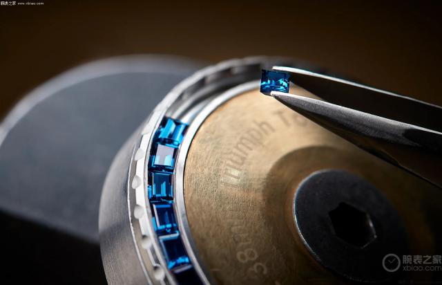 长阶梯形则贯穿整个阶梯 J12 Bleu 系列,比如 J12 Bleu Caliber 12.1 手表(38 mm)和 J12 Bleu Caliber 12.2 手表(33 mm)表圈,全部呈现长阶梯刻纹。J12 Bleu 蓝宝石手表上所有的蓝宝石,也是长阶梯形的。另外,值得注意的是,香奈儿手表上所有的宝石镶嵌工艺都是在香奈儿制表厂完成的。