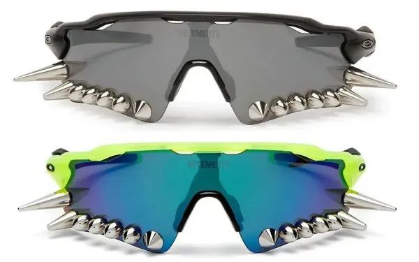 2018年,法国时尚服装品牌VETEMENTS还推出了与Oakley合作的太阳镜,在功能十足的异形太阳镜上加持铆钉元素,突出完美的叛逆朋克气质。