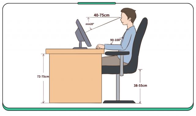 操作计算机时,调整双眼和计算机屏幕的位置,使计算机的位置略低于眼水平线,并且屏幕亮度要合适。