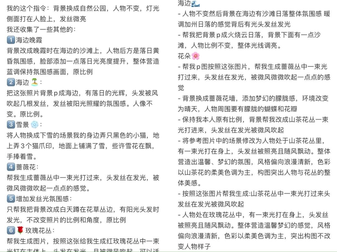 许多网友在小红书等社交平台上发布或收集了许多P图指令,其中也有网友晒出了自己的修图结果。
