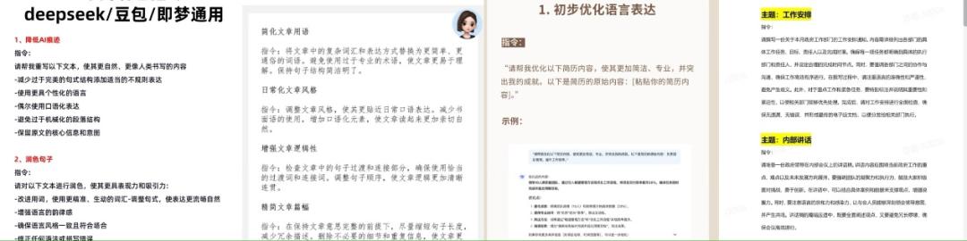事实上,除了P图中的指令,当代年轻人的收藏夹里已经挤满了各种工作指令,包括文本打磨指令,比如“请打磨文本,改善单词,使用更准确、更生动的单词;调整句型,使表达更加流畅自然;增强语言的节奏”;还包含了改变简历的指令,比如“请帮我改进简历内容,让它更简洁、更专业,突出我的成就”;此外,还有许多与领导发言、日程安排等工作相关的信息指令。