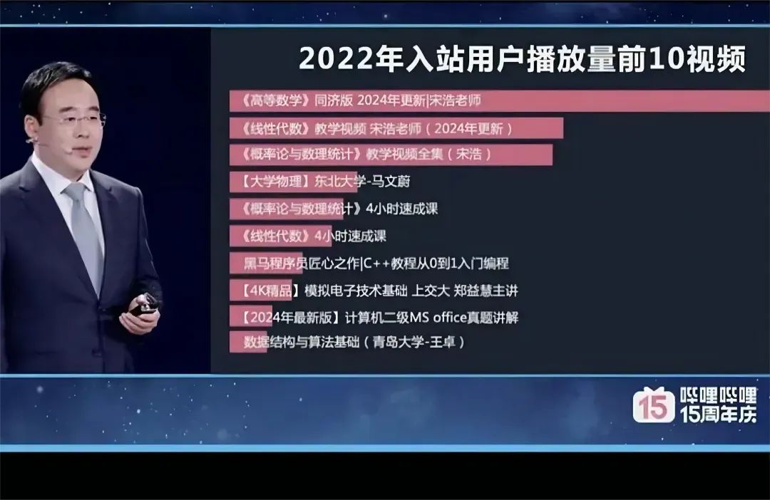 B站CEO陈睿在哔哩哔哩15周年庆典上发表了一篇以“与你一起成长”为主题的演讲。在演讲中,陈睿发布了很多数据,其中包括00后人群观看量排名前十的视频是各种大学课程。在这些课程中,山东财经大学宋浩先生共上了1.6亿个数学课,评论数达286万条。换句话说,每十个观众都会发表评论,这意味着大约有2860万大学生在一年内学习过这门课程。值得注意的是,这个数字相当于中国本科生的总数。