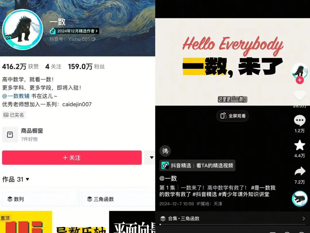 教育自媒体作为全网“最会讲高中数学”,“一数”讲解教师均毕业于985名校,具有深厚的学术背景和丰富的教学经验。娱乐价值官看了之后发现,“一数”的教学视频以幽默的语言、贴近生活的例子和简单的解释吸引了人们的注意力。“一数”进入Tiktok后,吸引了客户的追捧。很多网友惊呼“这是Tiktok,对吗?”