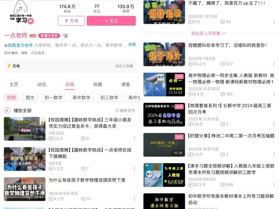 比如数学类 @一位教师,已有174万人 粉丝是哔哩哔哩有一定粉丝基础的UP大师。这位老师的特点是让孩子通过知识的思维导图和生活的例子轻松掌握中学数学知识。